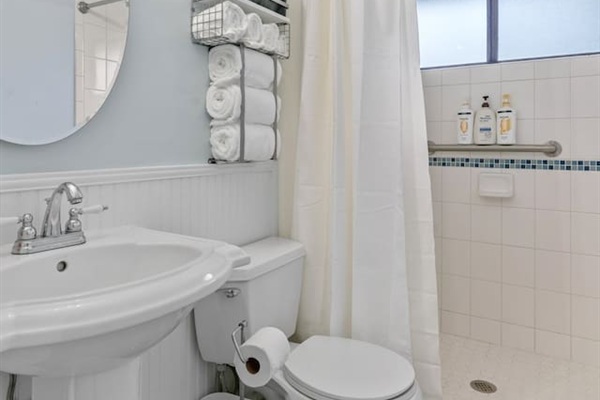 Outdoor shower with hot/cold water shampoo, conditioner and body wash